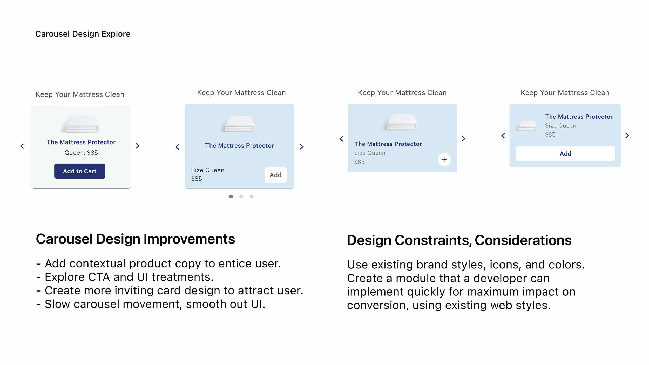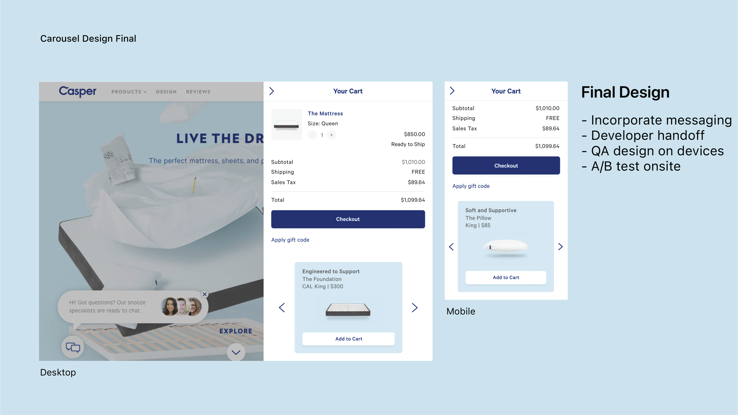I was an early designer at Casper (Series B), contributing to high-visibility initiatives, including improvements to the e-commerce checkout experience. This case study examines a shopping cart cross-sell feature that delivered statistically significant positive results. More design examples are available, upon request.