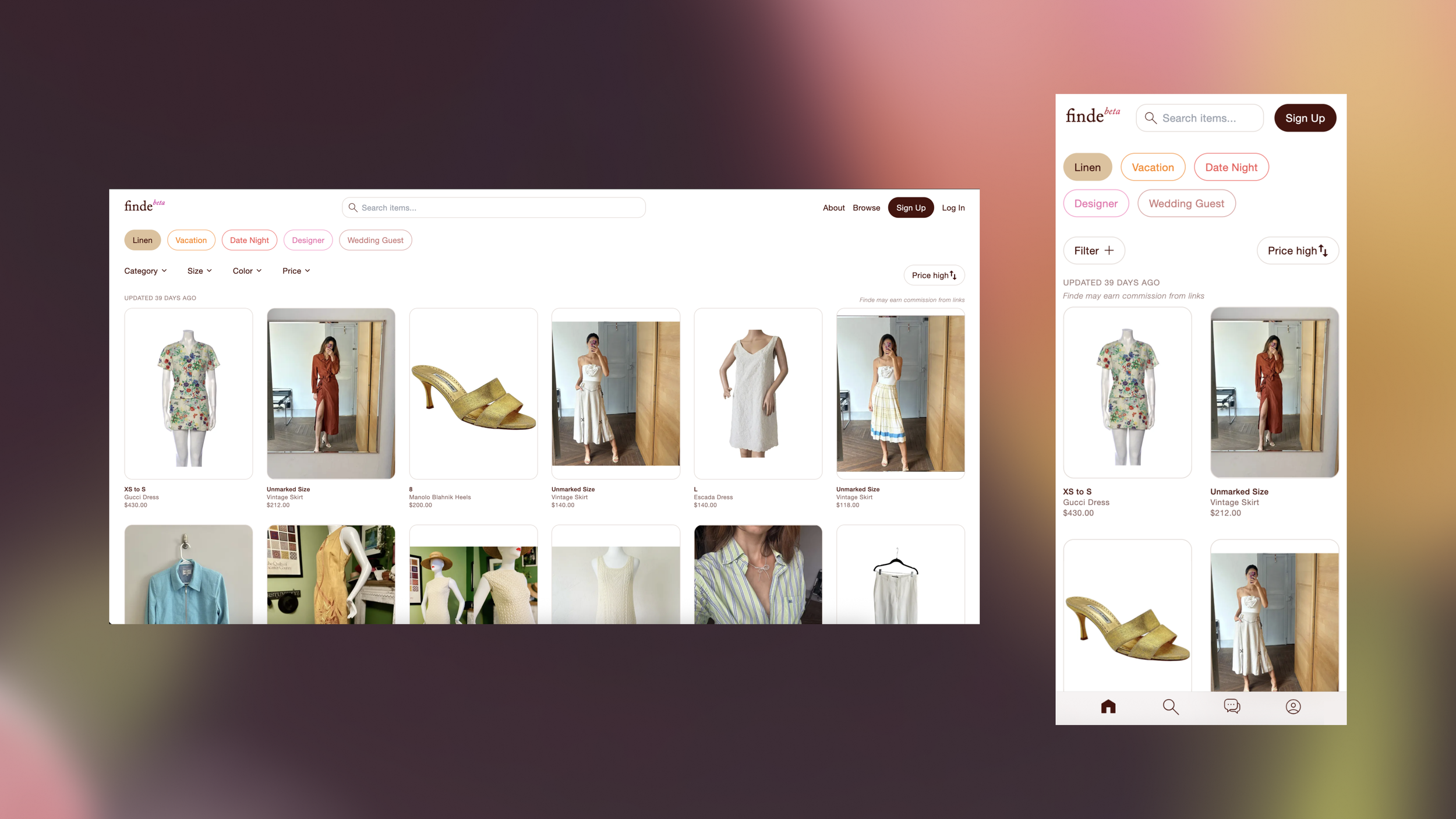 Finde is an e-commerce platform that integrates the eBay API to deliver real-time item listings and search. My goal was to design a shopping experience that feels curated yet comprehensive. More design examples available upon request.